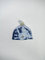 Unsere WARNA Knoten-Babymütze besteht aus angenehmer Bio-Baumwolle und ist im klassischen Batik-Stil mit Spirale eingefärbt in einem Farbverlauf von kräftigem blau über lila bis hin zu einem leichten lila.