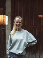 Der Sweater ist in der modernen Farbe "aloe" welche ein weicher Grünton zwischen grün und blau ist.