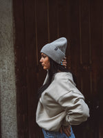 Unsere WARNA Oversized Beanie ist Unisex und passt sich flexibel jeder Kopfform an.