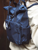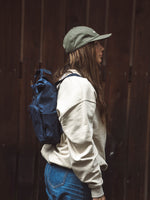 Unser WARNA Rucksack besteht aus recyceltem Polyester und ist ein sogenannter "Roll-Rucksack". Er besitzt oben eine große Öffnung, sodass du auch sperrige Sachen schnell ein- und auspacken, bzw. verstauen kannst. Kurz umrollen und mit einem Klippverschluss sicher verschlossen.
